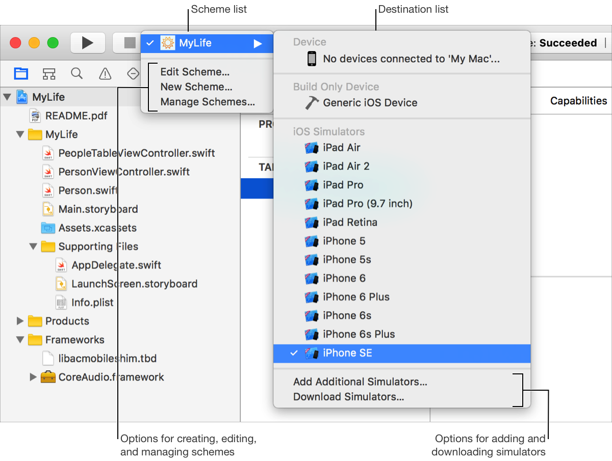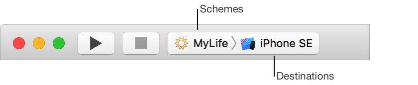 Use the scheme menu to switch the active scheme and destination. You can also use the scheme menu to create, edit, and manage schemes, and to add and download simulators.