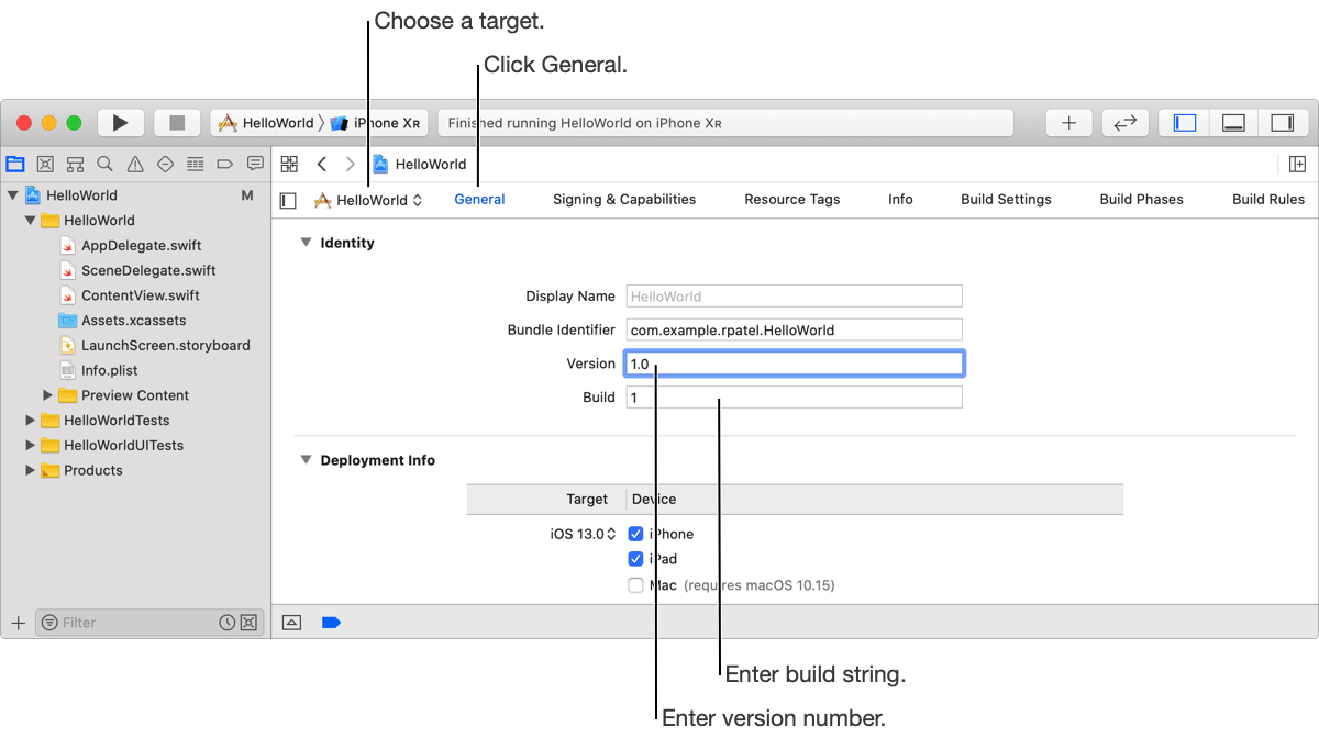 It’s important to initially set, and later update, the version number and build string before you upload or export your app because these numbers are used throughout the system to identify the build. Specifically, the version number and build string are used to identify crash reports and dSYM files for apps distributed through TestFlight or the App Store. For iOS apps, the system recognizes that the build string changed and properly syncs the new app version to the device.
