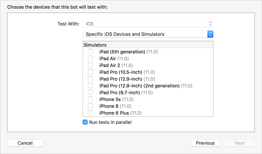 If you choose Specific iOS Devices and Simulators, select the devices and simulators you want to test with from the list that appears below. The devices must be connected to the Mac running Xcode Server to appear in the list.