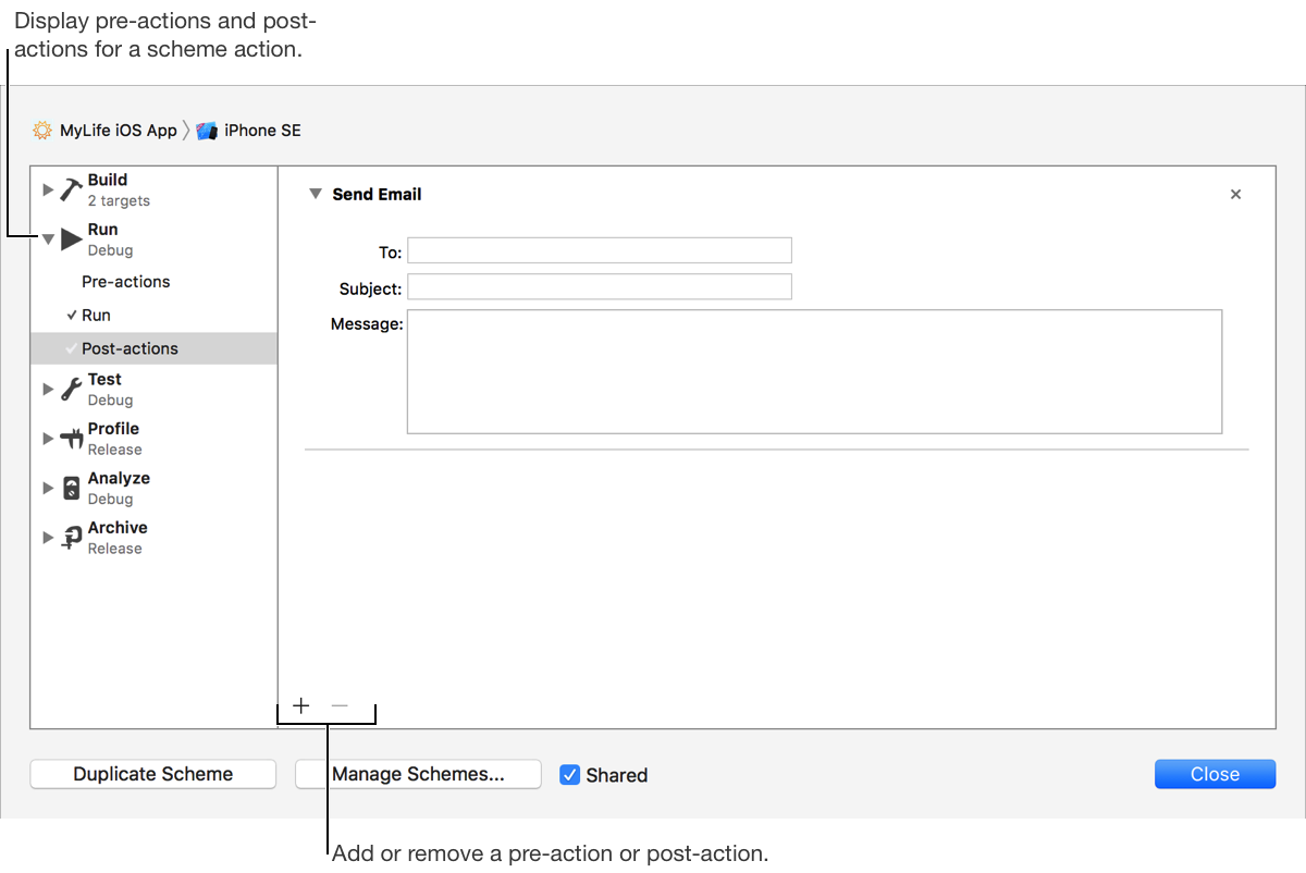 The scheme editor lets you specify settings that affect your workflow. The left column lists scheme actions that correspond to commands in the Product menu: Run, Test, Profile, Analyze, and Archive.