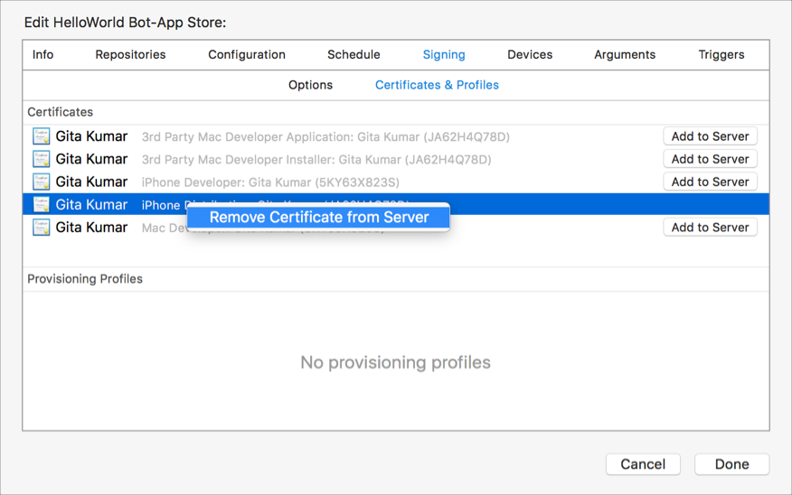 You have the option of allowing Xcode Server to manage your certificates and profiles for you, when you create a bot or on the Signing pane, when you edit a bot.