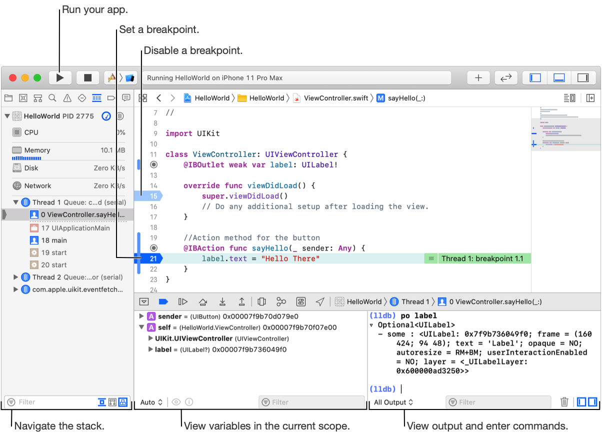 The debug bar contains buttons that disable or enable all breakpoints, control the execution of your app, enable graphical debugging of view and memory state, simulate location, override environment settings, and jump to stack frames.