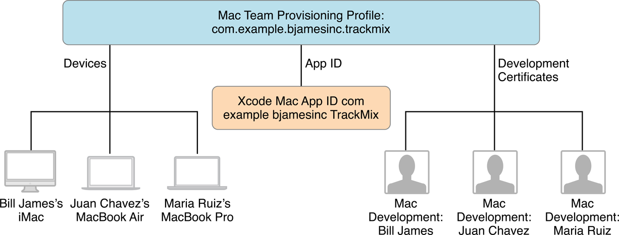 This diagram shows a Mac Team Provisioning Profile using an explicit App ID for an organization developing a macOS app.