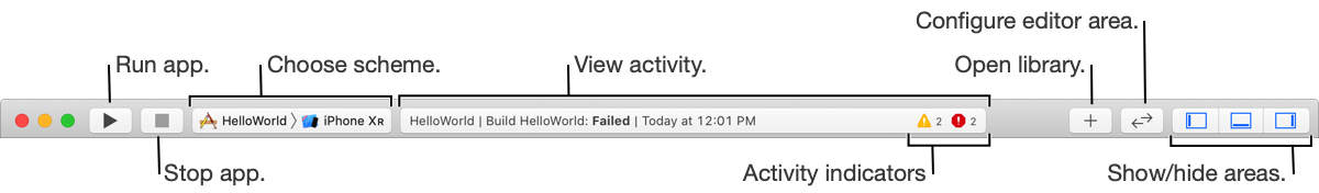 Use the toolbar to build and run your app, view progress and status of tasks, and configure areas of the main window. You’ll choose the target and run destination—for example, a simulator or device—from the scheme menu. Also, use the toolbar to choose an editing mode and to show or hide the main window areas.