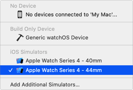 For watchOS apps, choose the WatchKit App target as the scheme, and choose an Apple Watch simulator.