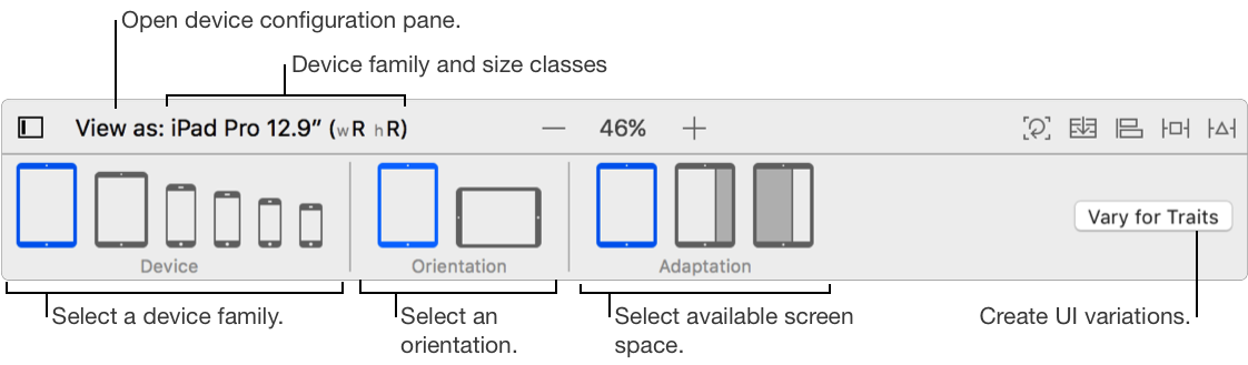 In Interface Builder, use the device configuration pane to configure the current device used to lay out objects on the canvas, and to create variations of the user interface for different configurations. A device configuration is a set of properties—for example, device family, orientation, adaptation, and interface style—that affects the layout, appearance, and capabilities of an app.