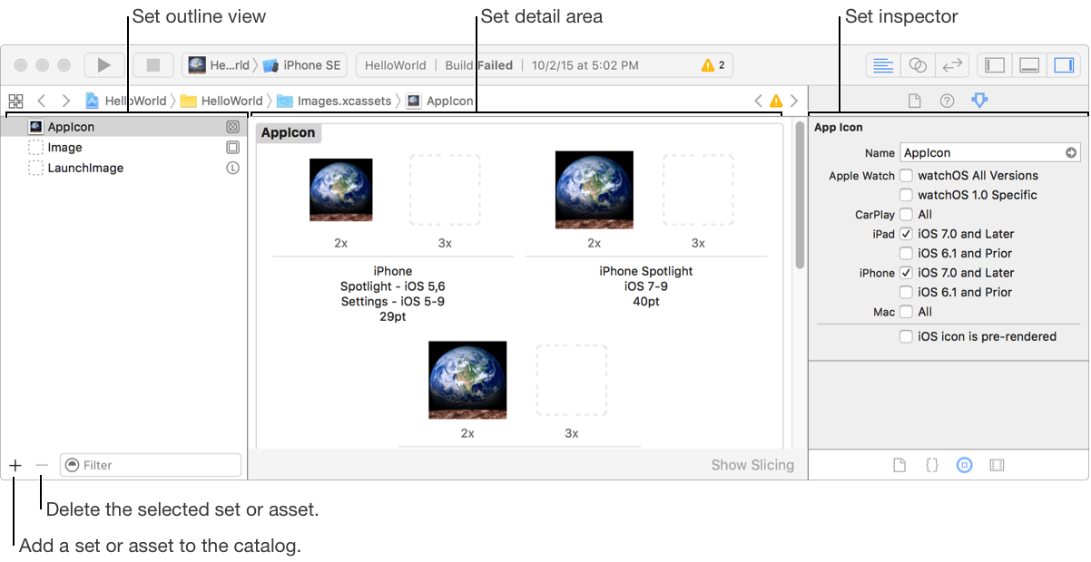 The associated asset catalog opens in the editor area. The app icon set is selected in the outline view, and wells for the different variations appear in the detail area.