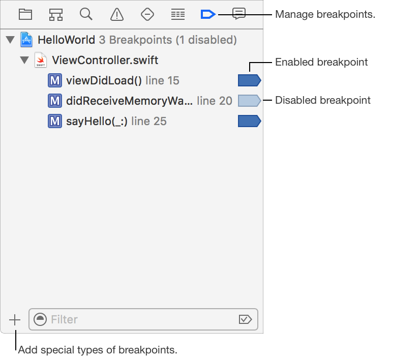 To manage your breakpoints, click the Breakpoint navigator () in the navigator area. You can view, disable, and delete breakpoints. To add special types of breakpoints, click the Add button (+) at the bottom of the navigator and choose a type of breakpoint from the pop-up menu. Control-click a breakpoint to display a contextual menu and explore more ways to manage your breakpoints.