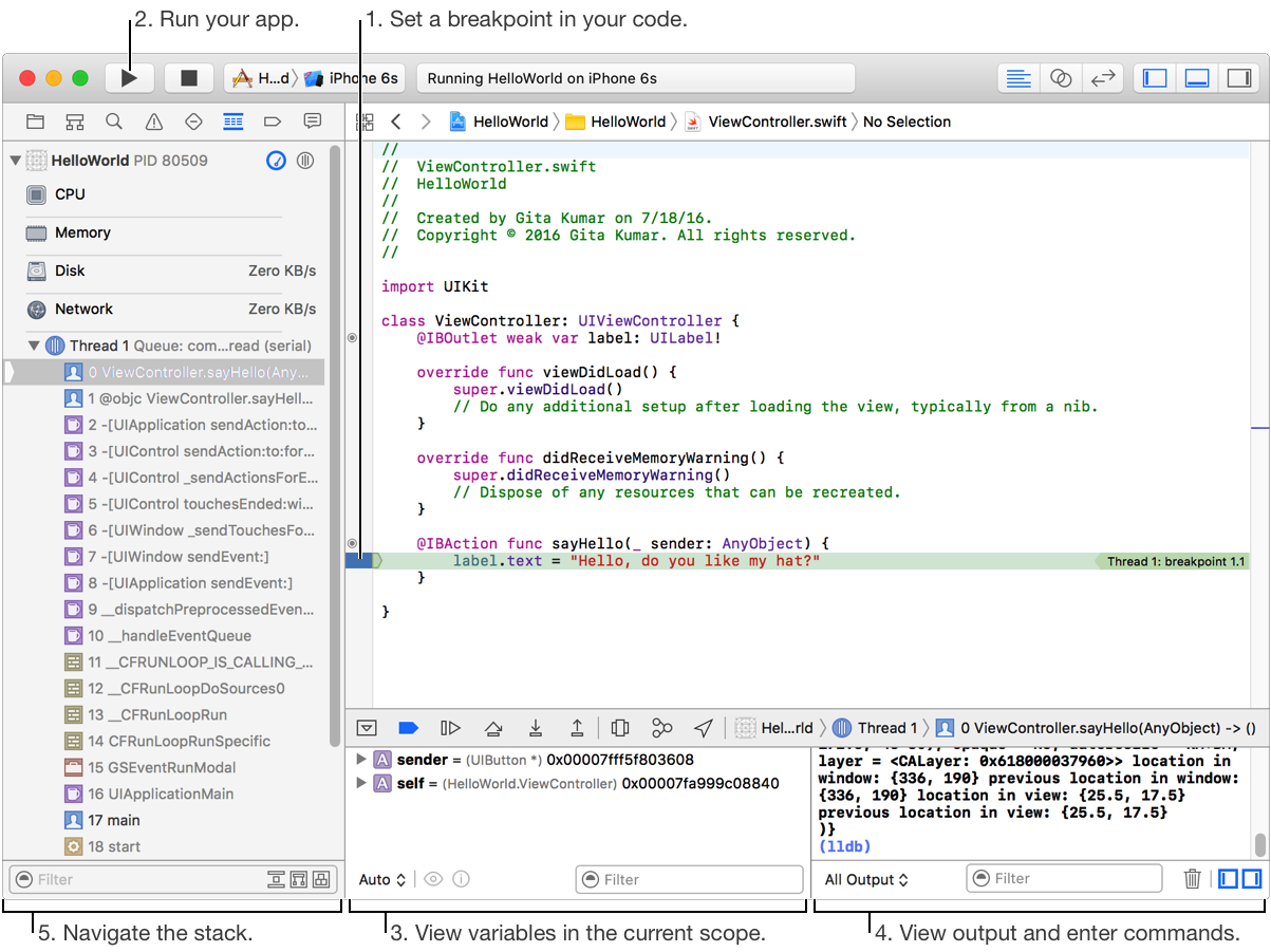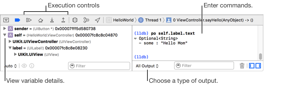 Use the Xcode debugger to inspect your code while running your app. The debug navigator and debug area automatically appear when you build and run your app. If necessary, show the navigator area by clicking the left button () and the debug area by clicking the middle button (