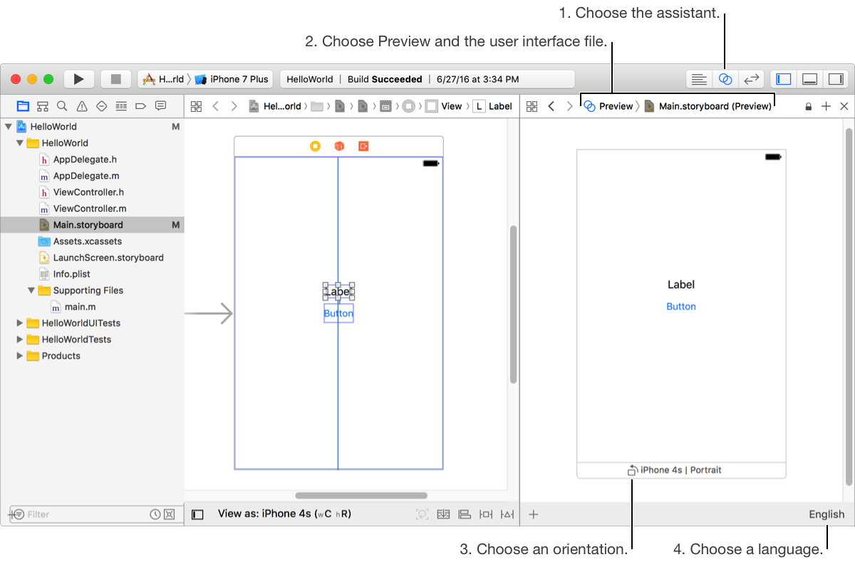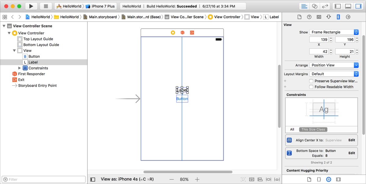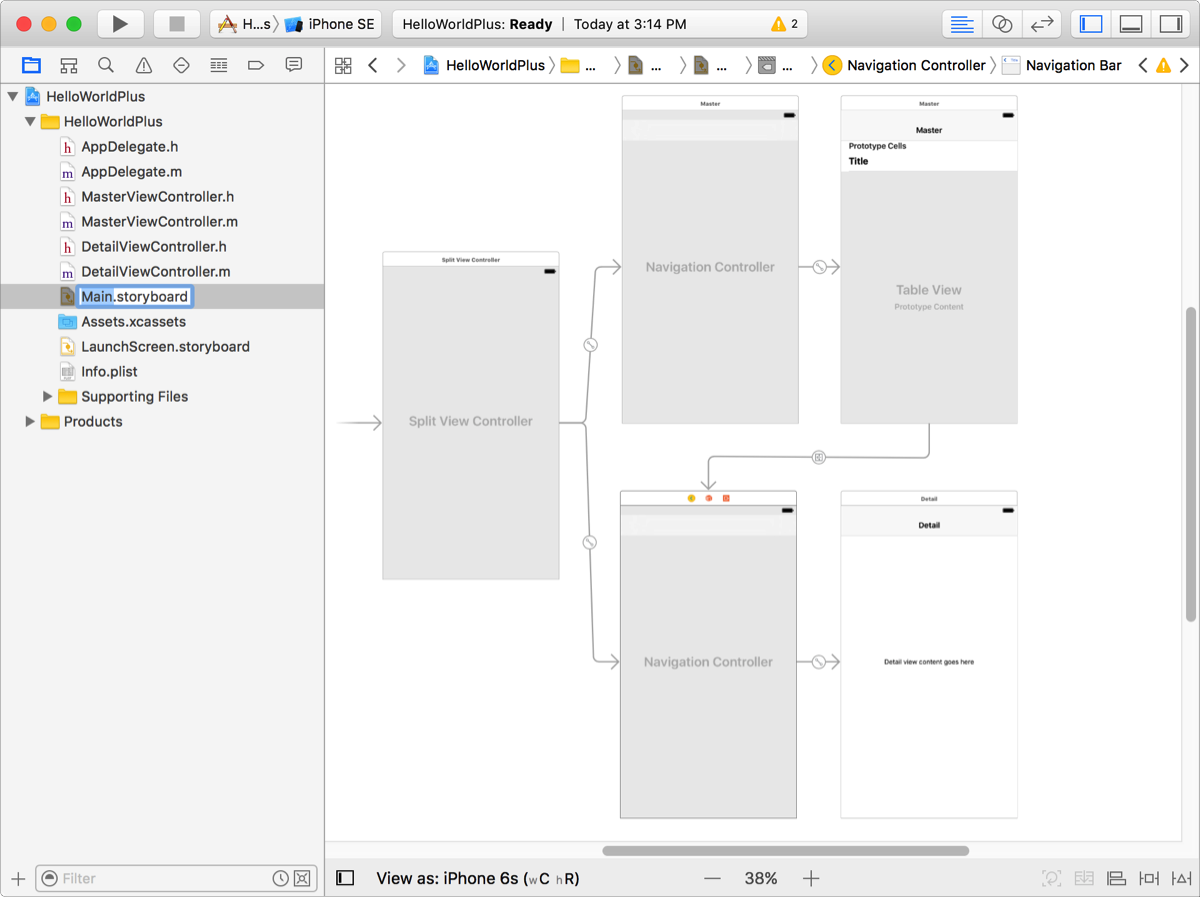 The views appear in the canvas area and the structure of the underlying objects appear in the outline view. If you create your project from a template, the Main.storyboard