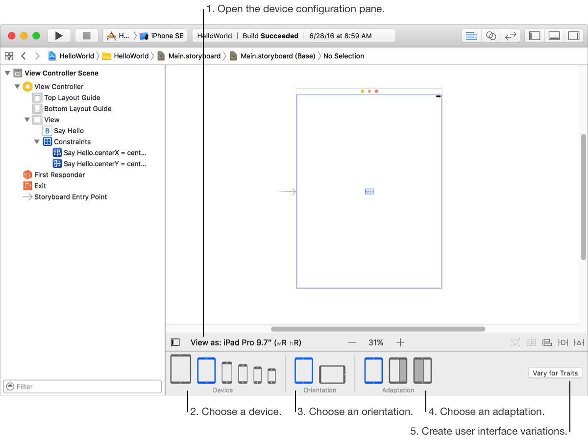 Select a user interface file in the Project navigator, and the file opens in Interface Builder in the editor area. The first time you open a user interface file, a sheet appears asking you to choose a device family from a pop-up menu. Pick the device you expect most people will use.