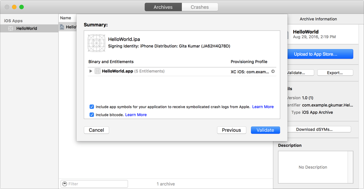 Before uploading your app to iTunes Connect, validate it to ensure that it passes standard iTunes Connect checks.