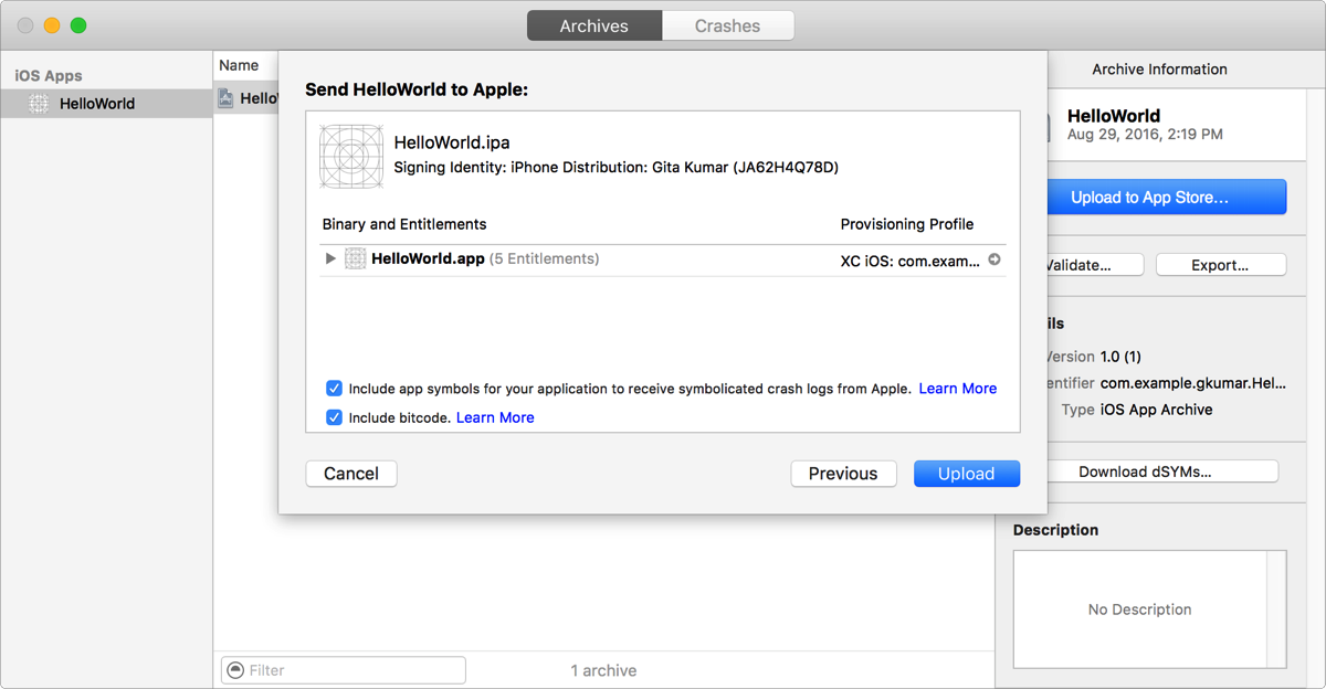 Optionally, use iTunes Connect to invite users to beta test your app. After you test your app, use iTunes Connect to submit your binary to App Review. If you included symbols when you uploaded your app in the Archives organizer, you can view crash reports in the Crashes organizer. For apps available on the App Store, users need to allow crash logs to be sent to Apple before they appear in Xcode.