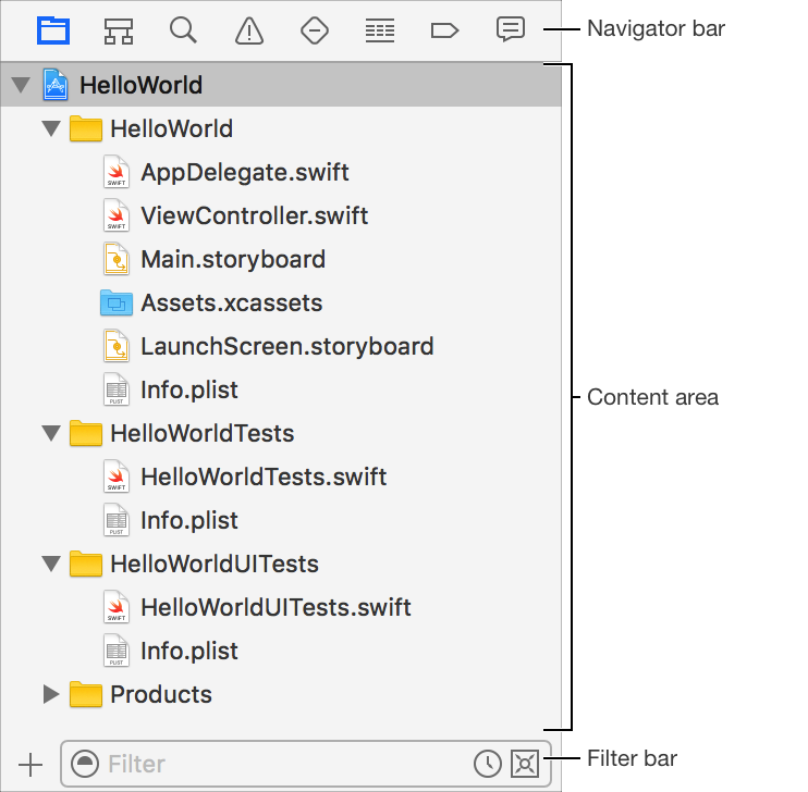 Use the Project navigator to open, add, delete, and organize files in your project. To switch to the Project navigator, click the Project navigator button () in the navigator bar. Your project files are displayed in the content area below. To open a file in the editor area, click the file in the Project navigator. To search for a file, enter text in the filter text field at the bottom of the Project navigator.