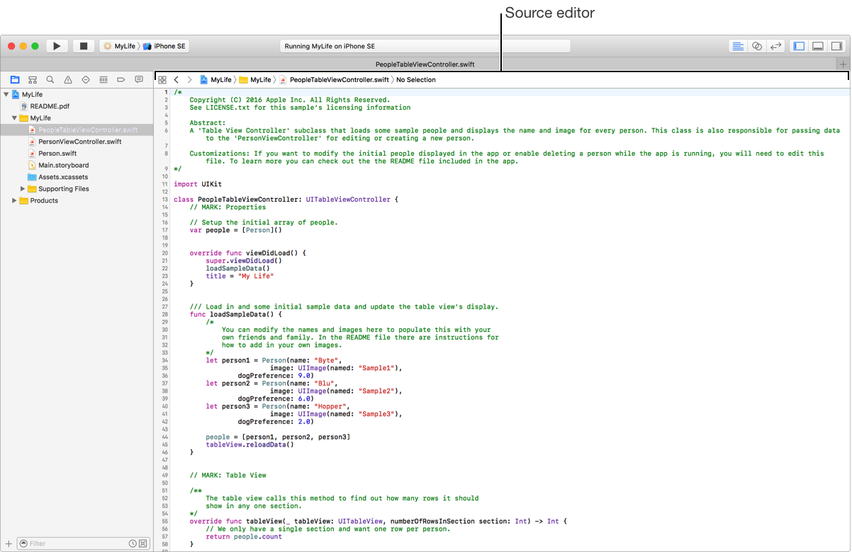 The source editor is where you write and edit code. When you select a source file in the Project navigator, the file opens in the source editor.