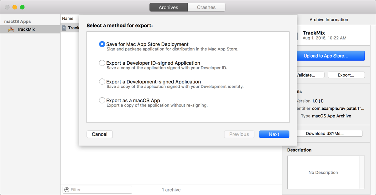 Note: If the Export button is disabled, verify that the archive contains a single top-level app.
