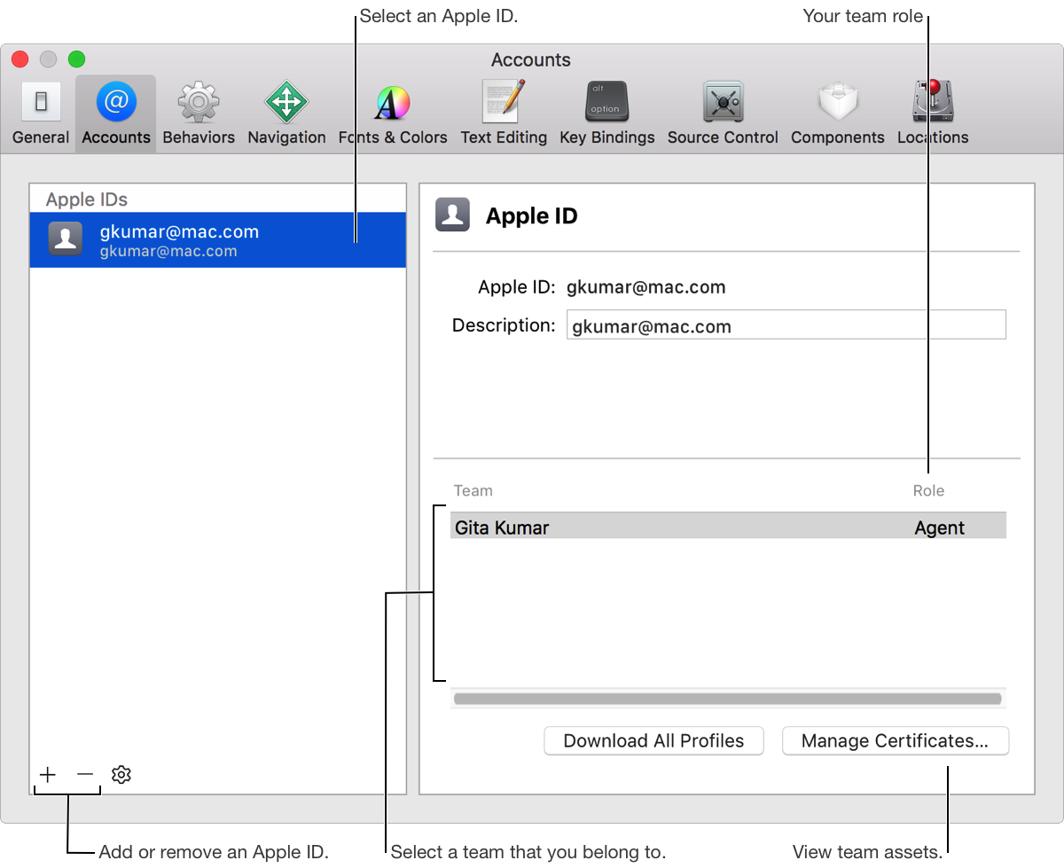 In Accounts preferences, enter your Apple ID that identifies you to Apple and allows you to assign a team to your project.