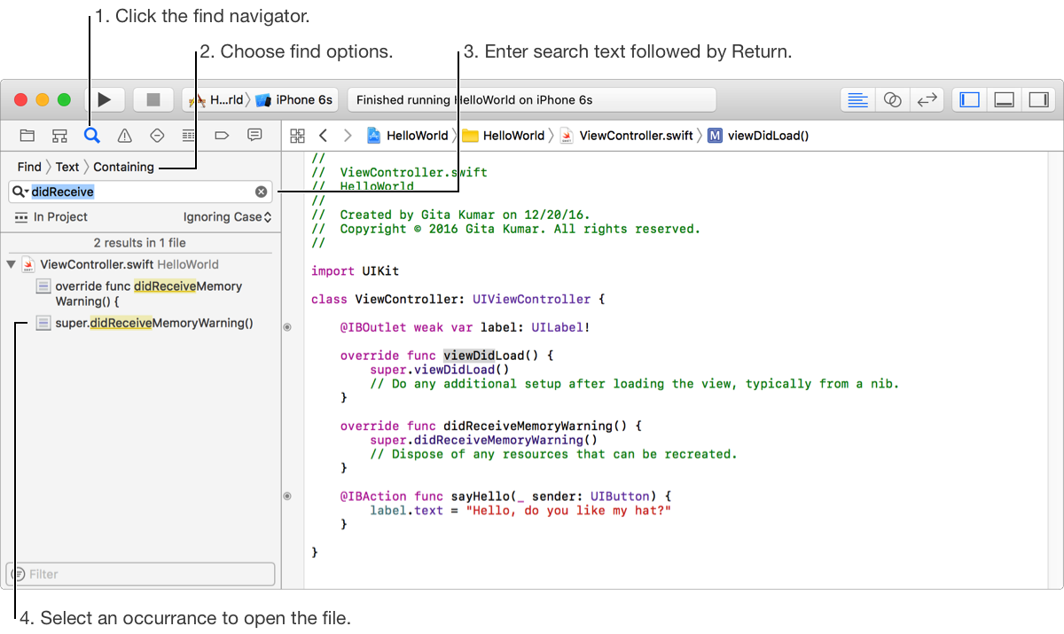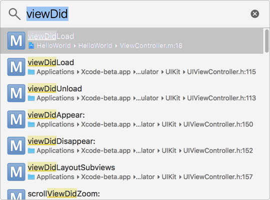 To search for symbols in your project and across the system frameworks, choose File > Open Quickly (Command-Shift-O) from anywhere in your project. In the search field popover, enter text followed by Return.