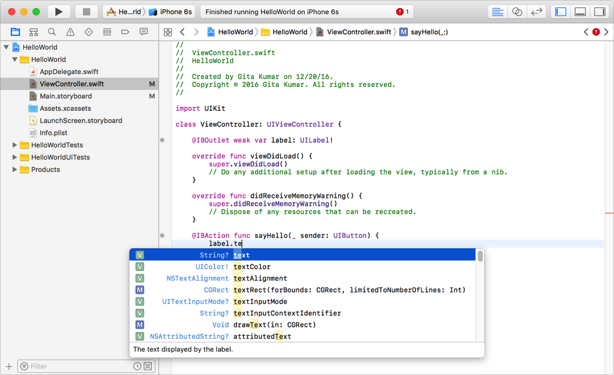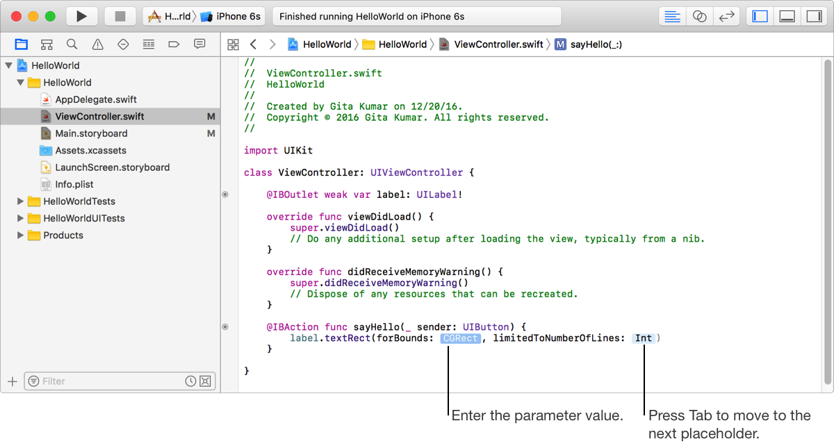 When you begin typing the name of a symbol, Xcode offers inline suggestions for completing the name. Click an item in the suggestion list to select it, or use the Up Arrow and Down Arrow keys to change the selected suggestion. Press Return to accept a suggestion.