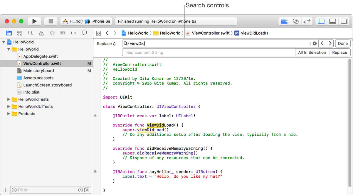 To find and replace text in the source editor, choose Find > Find and Replace (or press Option-Command-F). The search controls appear above the source file. As you type the search string in the first field, Xcode searches the file and highlights the occurrences of the string. Enter a replacement string in the second field. To replace the occurrence and find the next, click Replace. To replace all occurrences, click All.