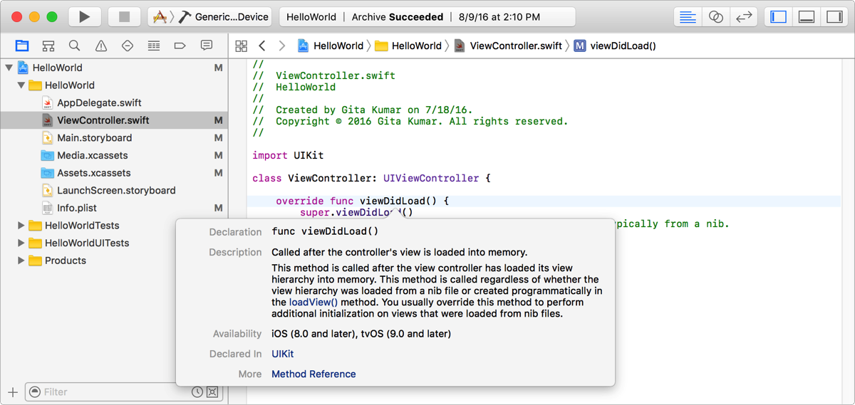 To read a description of a symbol, Option-click the symbol, and a Quick Help popover appears. To view the full documentation for a symbol, click the Declared In or More link. To dismiss a Quick Help popover, click anywhere in the source file.