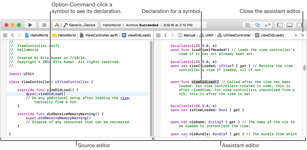 To view a symbol declaration, Option-Command-click the symbol in the source editor. Xcode opens the assistant editor next to the source editor and displays the file containing the symbol declaration. To remove the assistant editor, click the close button in the upper-right corner. To navigate to a file without opening the assistant editor, Command-click the symbol. Alternatively, use the jump bar at the top of the source editor to navigate to methods and properties.