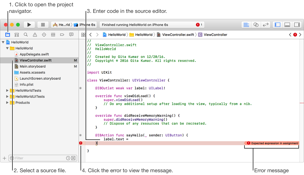 To enter code, position the pointer at the desired insertion point in the file, press Return to create a new line, and begin typing. As you type in the source editor, Xcode scans your text. When you make a syntax error, Xcode marks it with a red underline or a caret (^). If an error icon appears, click it to display a message describing the issue.