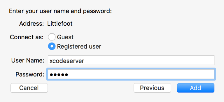4. In the sheet that appears, enter the system account credentials that will run Xcode Server, and click Add.