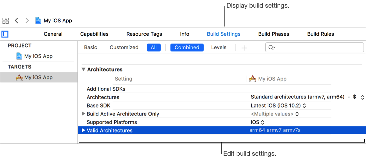 Declaration name (also referred to as “name”) | This name is displayed in the Build Settings pane of the project editor when Xcode is set to show setting names. Declaration names are also displayed in the Quick Help inspector when a build setting is selected in the project editor. Declaration names are also used in build configuration files and by the |