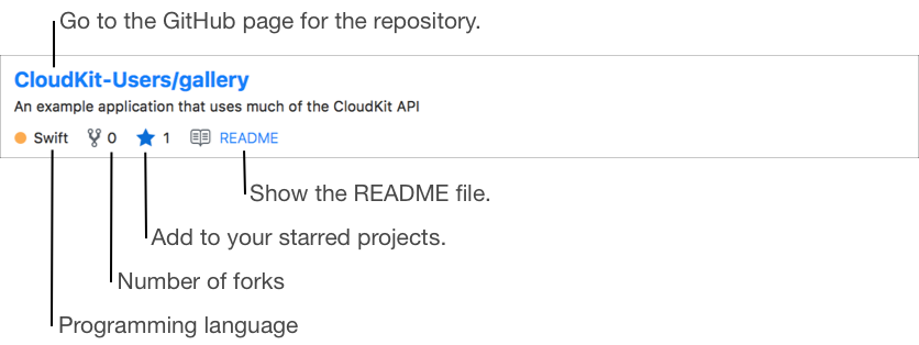 The detail area shows the programming language, number of forks for this project, and number of people who added it to their starred projects.