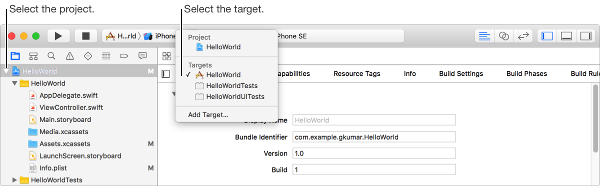 In the Project navigator, select the project and in the project editor, select the target.