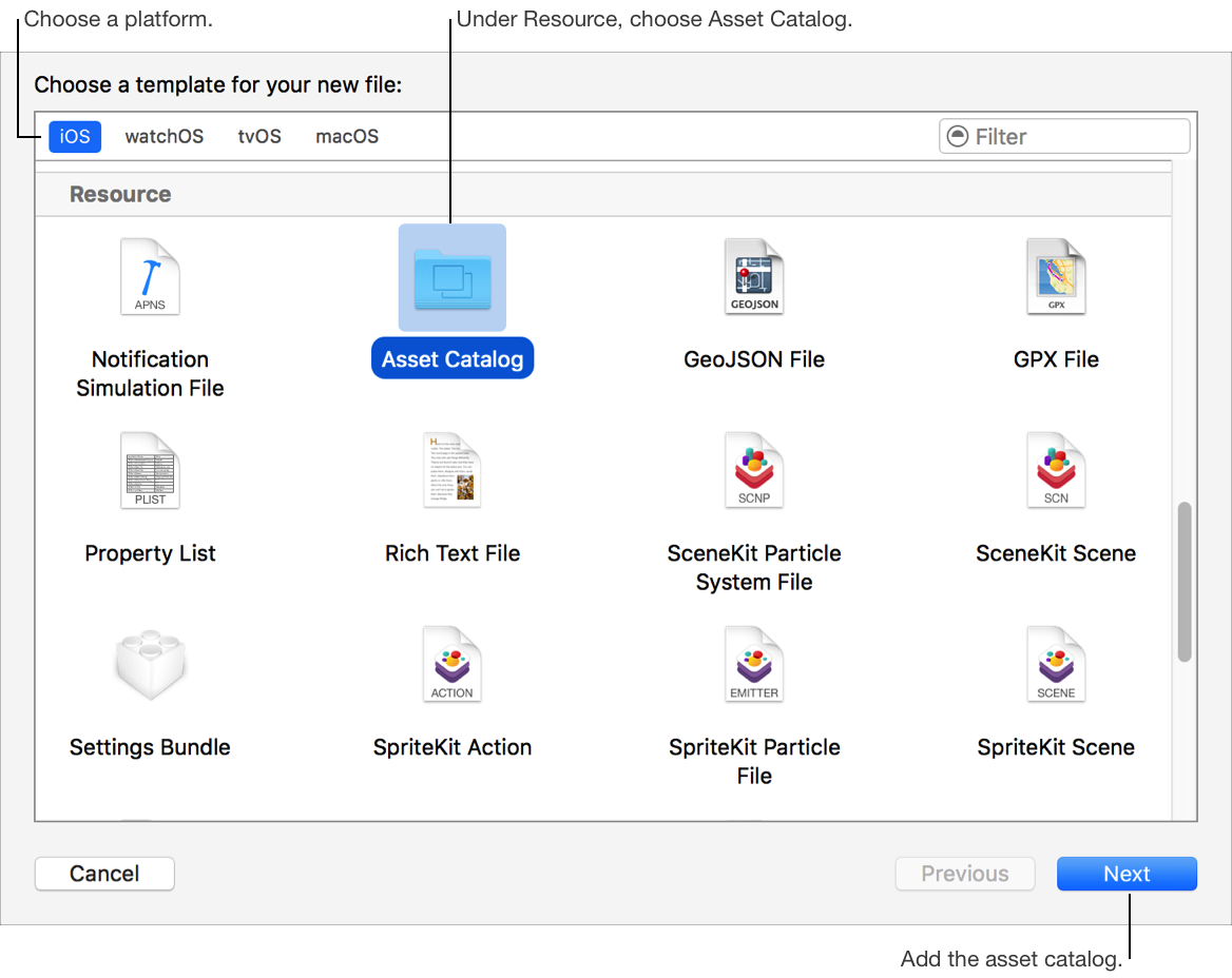 Add a new file from a template and in the sheet under Resource, select Asset Catalog and click Next. The new asset catalog will appear in the Project navigator and open in the editor area.
