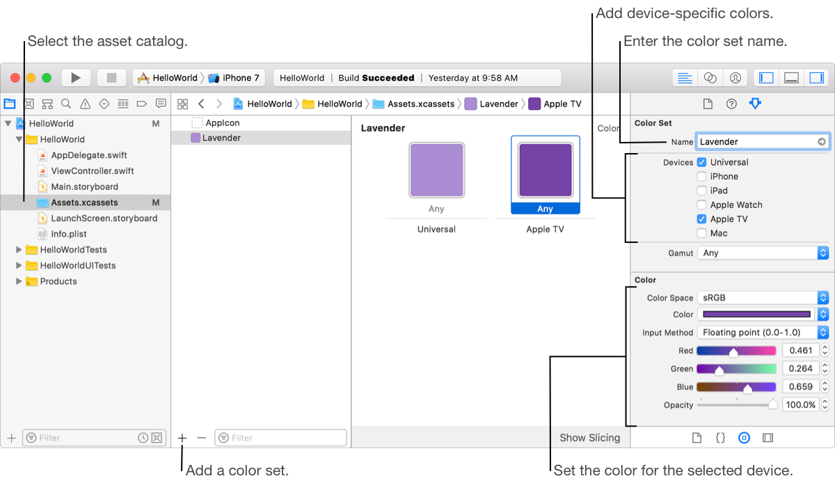 Choose New Color Set from the Add button (+) menu at the bottom of the outline view, or choose Editor > Add Assets > New Color Set.