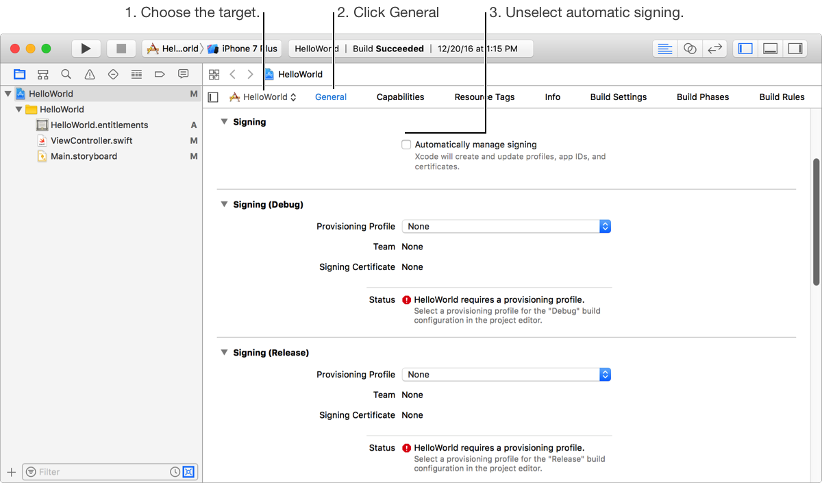 Use manual signing if you want to create your own provisioning profiles and signing certificates. For example, you use one build configuration to develop for the App Store and another build configuration to develop for distribution outside of the App Store. You’ll need to sign in to your developer account to perform some of the signing steps manually.