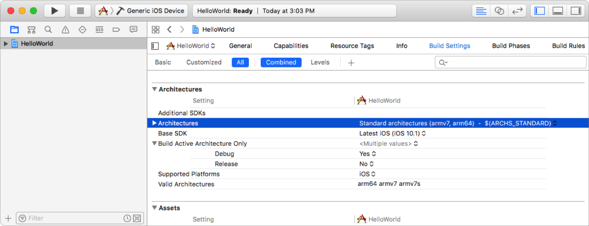 The Architectures build setting identifies the architectures for which your app is built. An iOS device uses a set of architectures, which include armv7 and arm64. You have two options for specifying the value of this setting: