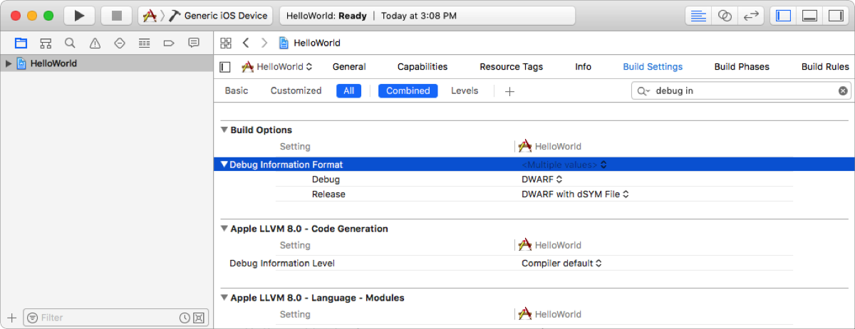 In the project editor, choose the project or target, click Build Settings, and find the build setting called Debug Information Format under Build Options.