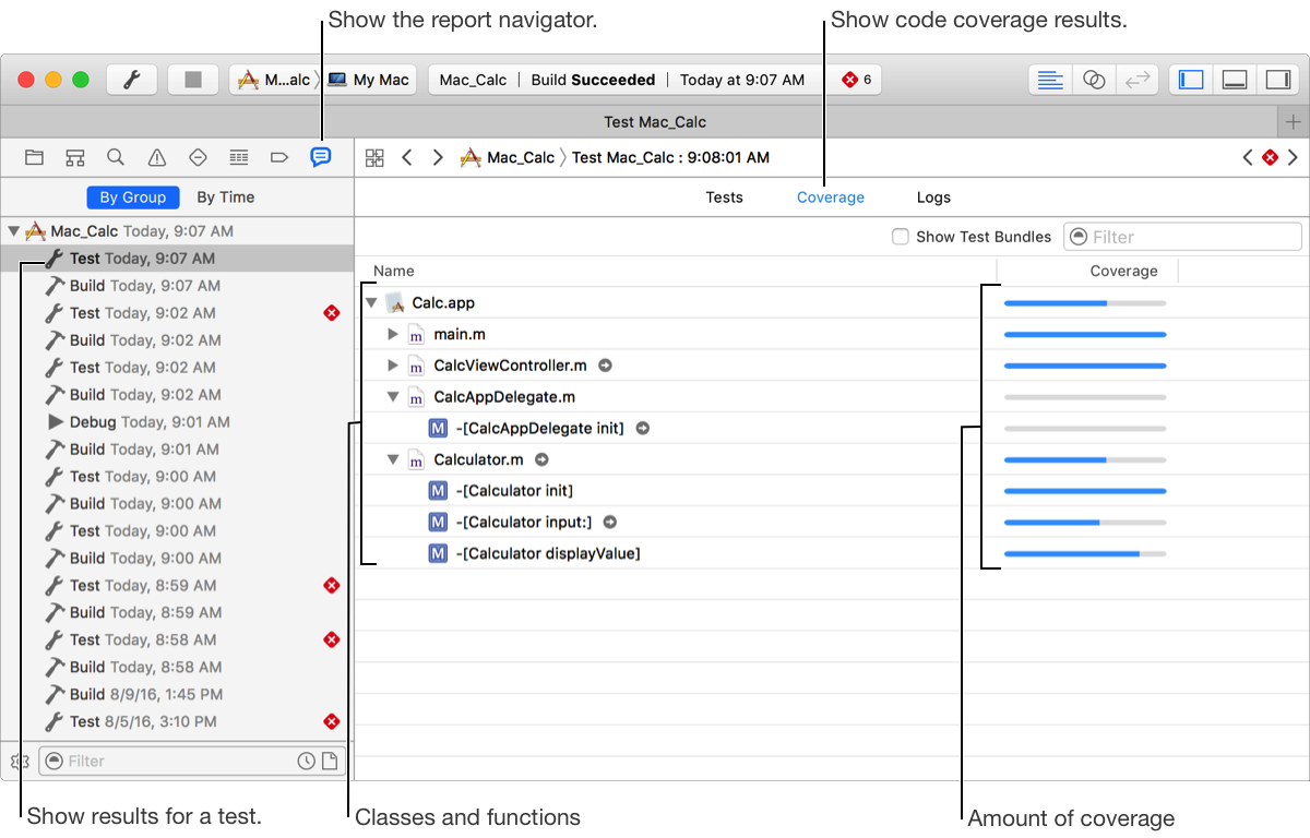 Code coverage enables Xcode to use the compiler to gather statistics about your source code and display the results after tests are run. The Report navigator shows where methods and functions were not reached by tests.