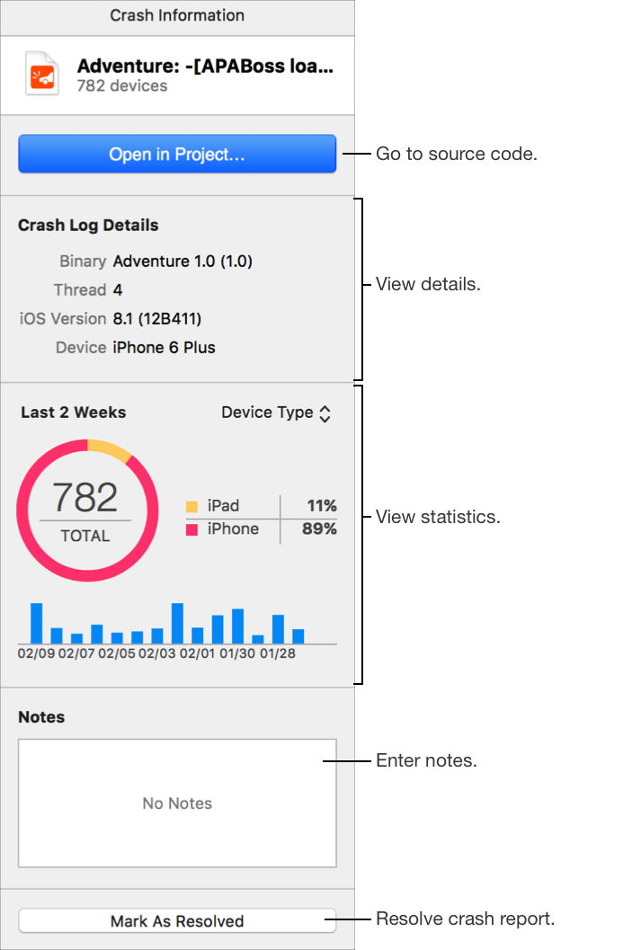 Add notes about a crash report: In the inspector, enter text in the Notes field at the bottom.