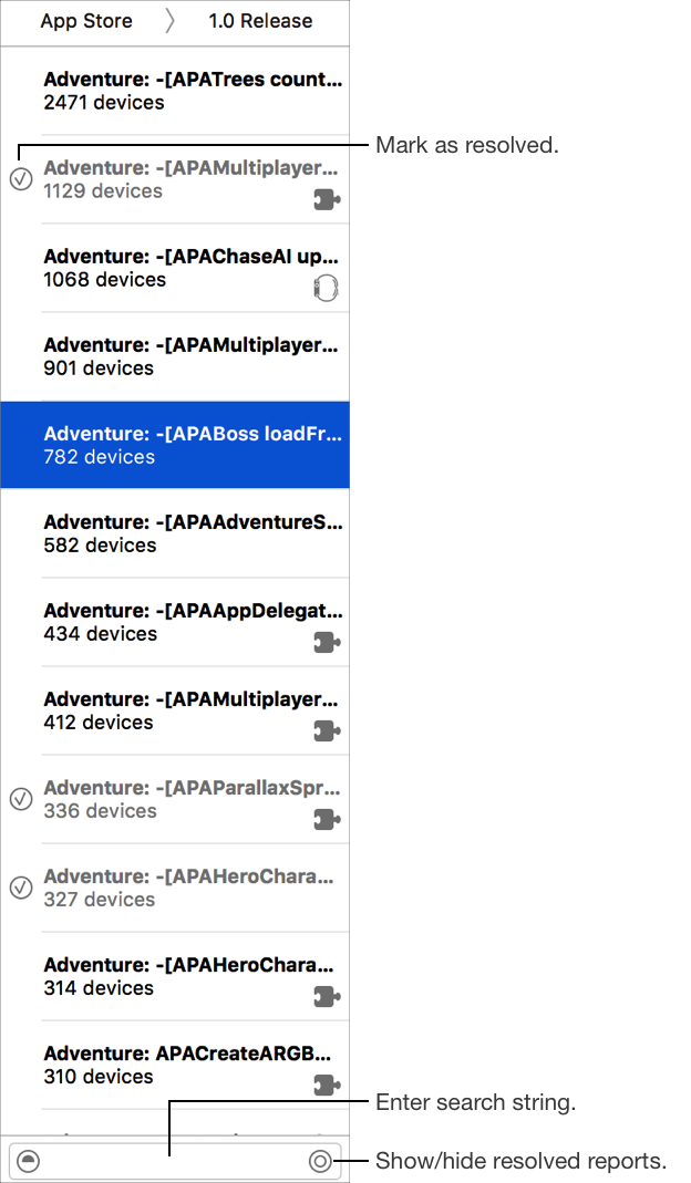 Mark the crash report as resolved: In the inspector, click “Mark as Resolved.” Alternatively, in the detail area, select the circle to the left of the title in the header or in the list of crash reports, click the circle next to the crash report.