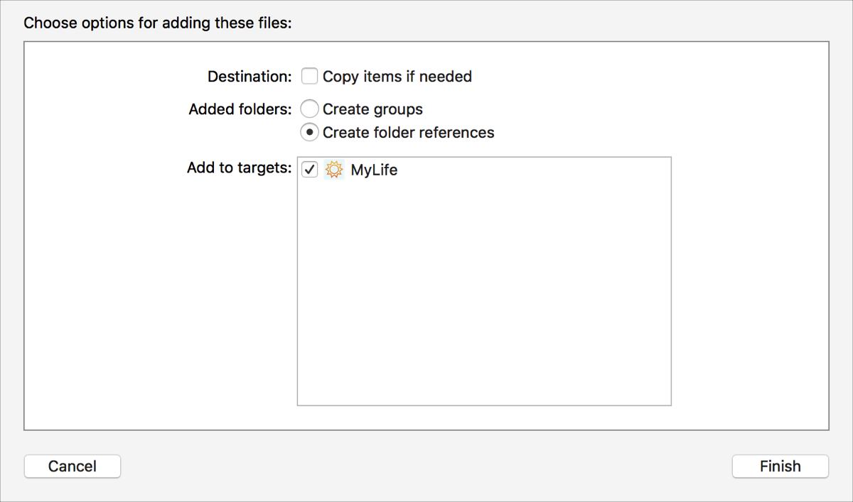 Copy the files and folders into the project: Select “Copy items if needed.”