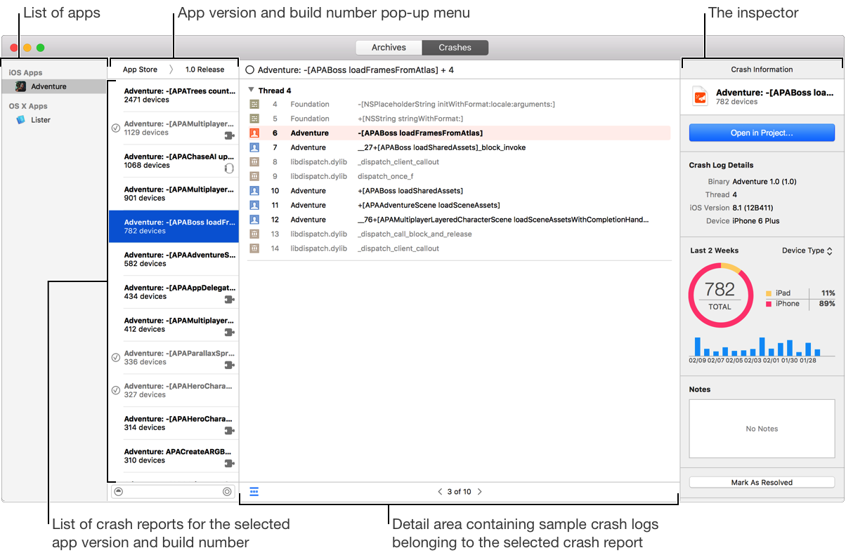 The detail area shows the crash logs (one at a time) for the selected crash report. A crash log groups the stack frames by threads. Stack frames in your app are denoted with a person icon (