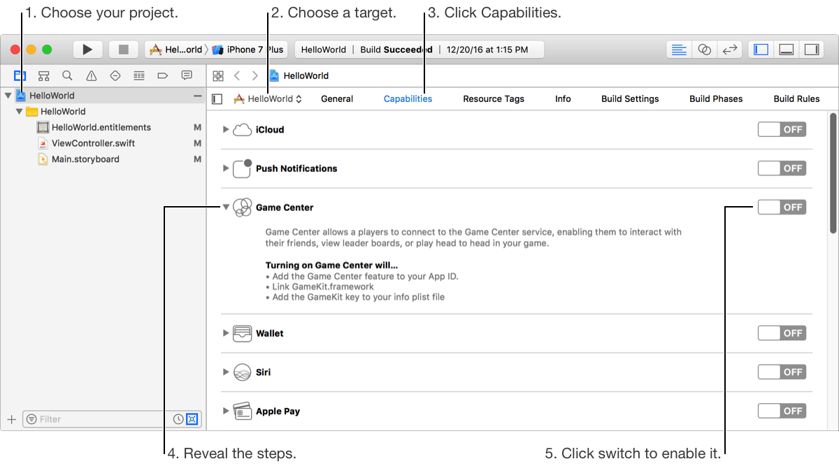 If Xcode successfully enables the capability, checkmarks appear to the left of each step. Some configuration steps include adding frameworks to your project. For example, when you enable Game Center, the GameKit framework is added to your project. If a step fails, an error icon appears next to the step.