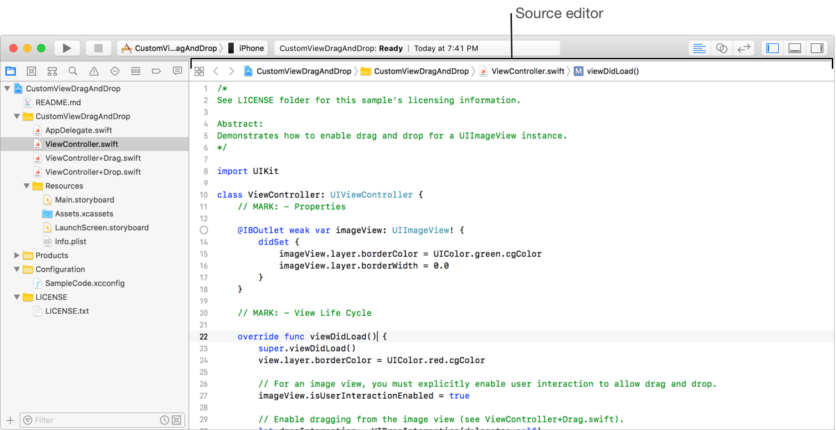 The source editor is where you write and edit code. When you select a source file in the Project navigator, the file opens in the source editor.