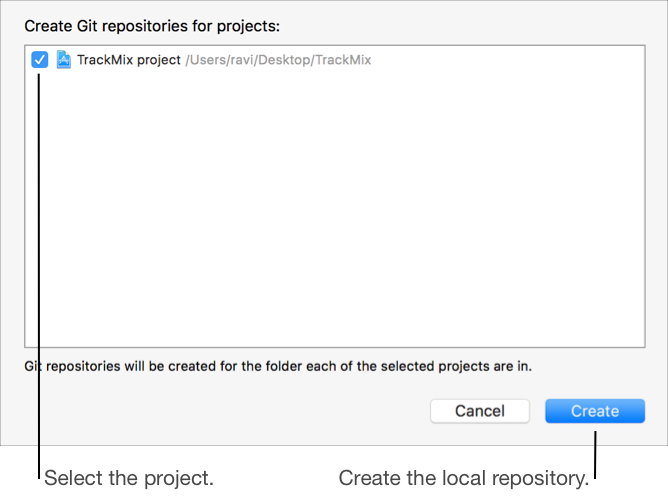 Alternatively, you can create a local source code repository when you create a new Xcode project from a template. In the last sheet, select “Create Git repository on my Mac” before you click Create.
