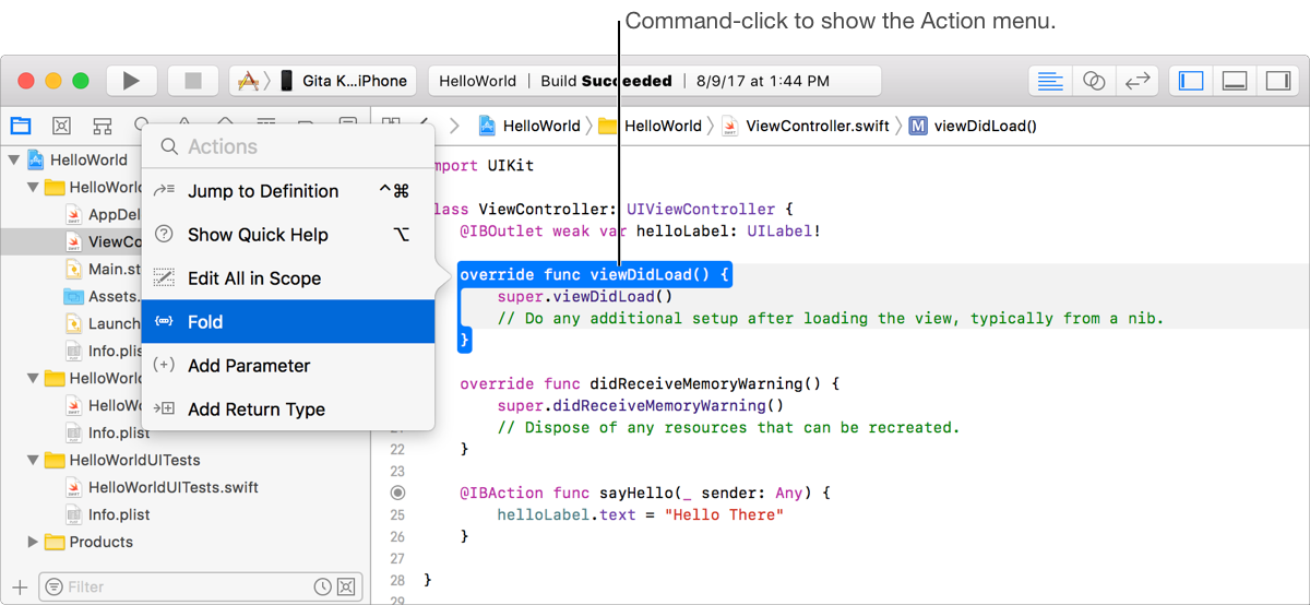 You can perform some actions on structures in your code such as methods and symbols. Hold the Command key and move the pointer around your code to highlight the different structures. Command-click on a highlighted structure and choose an action from the Action menu.