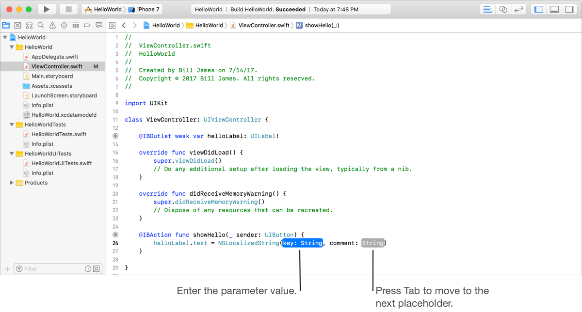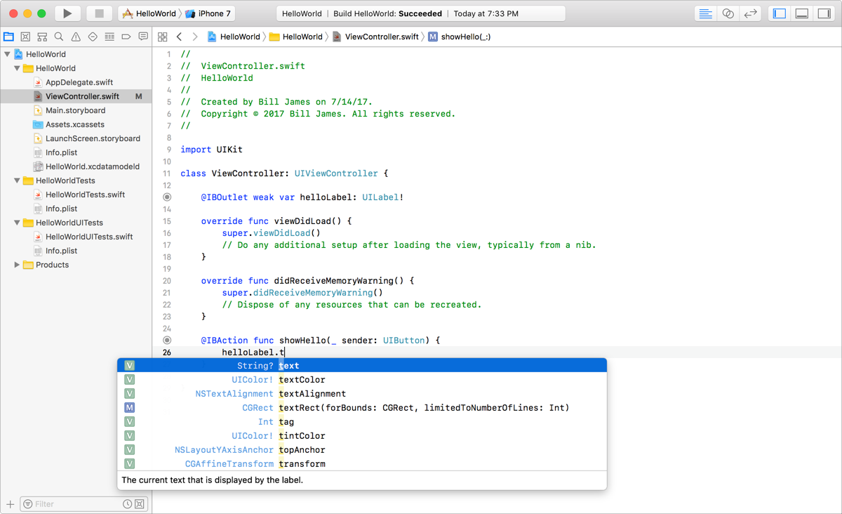 When you begin typing the name of a symbol, Xcode offers inline suggestions for completing the name. Click an item in the suggestion list to select it, or use the Up Arrow and Down Arrow keys to change the selected suggestion. Press Return to accept a suggestion.
