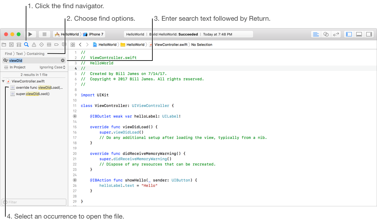 ) in the navigator area. Enter text in the search field followed by Return, and Xcode displays occurrences of the string in the entire project. Select an occurrence to view it in the editor area. To scope the search, above the text field, choose a string type and options. To find all occurrences that start with a string, choose Find > Text > Starting with. To find symbols that start with a string, choose Find > Definitions > Starting with.