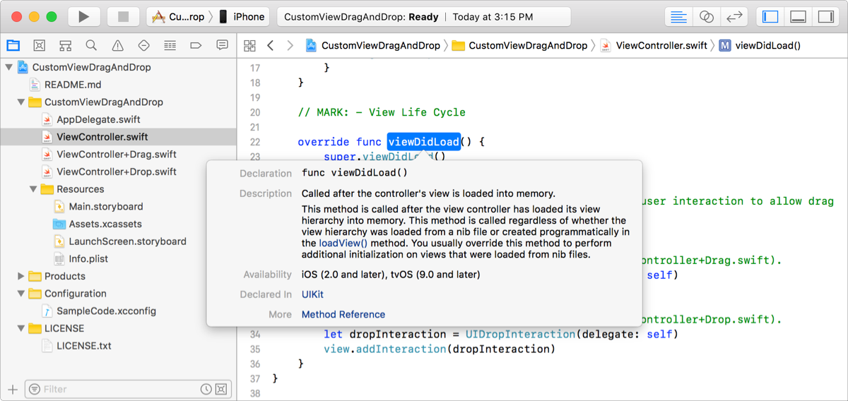 To read a description of a symbol, Option-click a symbol or choose Show Quick Help in the Action menu to display a Quick Help popover. To view the full documentation for a symbol, click the Declared In or More link. To dismiss a Quick Help popover, click anywhere in the source file.