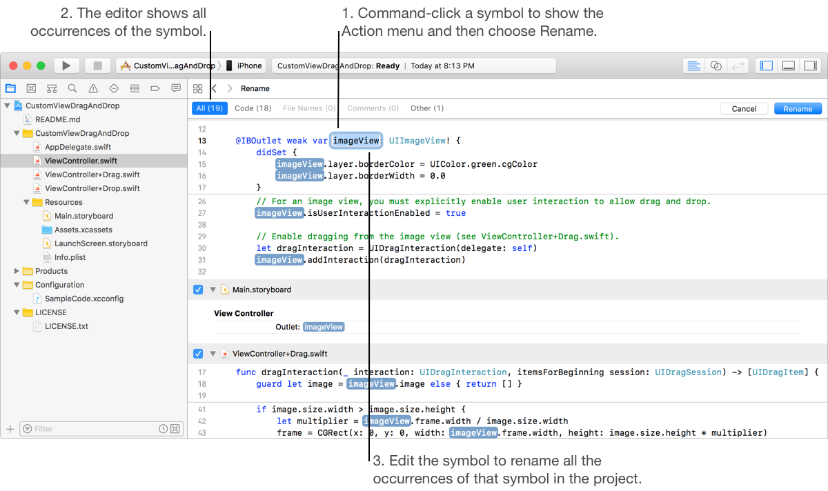 To rename a symbol in the entire project, choose Rename in the Action menu. The edit area collapses to show all source, Interface Builder, and Core Data files in which the symbol occurs. As you edit the symbol, all occurrences are updated with the changes. Press Return to accept the changes or Escape to cancel. For example, choose Rename when you want to change the name of an outlet or action so that you don’t break the connection you made in Interface Builder.