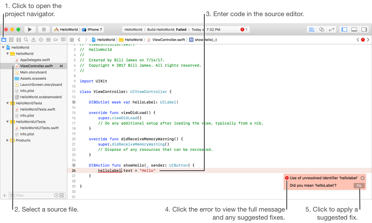 To enter code, position the pointer at the desired insertion point in the file, press Return to create a new line, and begin typing. As you type in the source editor, Xcode scans your text. When you make a syntax error, Xcode marks it with a red underline. If an error icon appears, click it to display a message describing the issue and any suggested fixes. Click on the Fix button next to a suggestion to update your code.